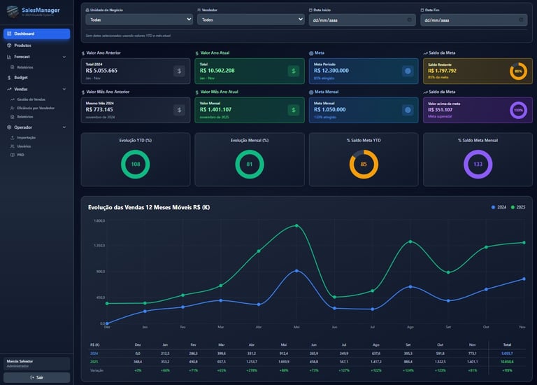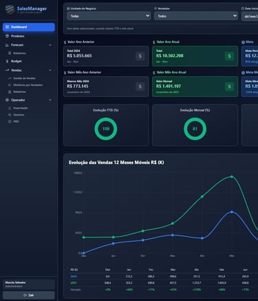 Desenvolvido com IA o sistema integra controle de produtos, gestão de vendas, previsões (forecast), análise de desempenho de vendedores e relatórios executivos, proporcionando visão 360° do negócio e apoiando a tomada de decisão através de dados estruturados e análises inteligentes.